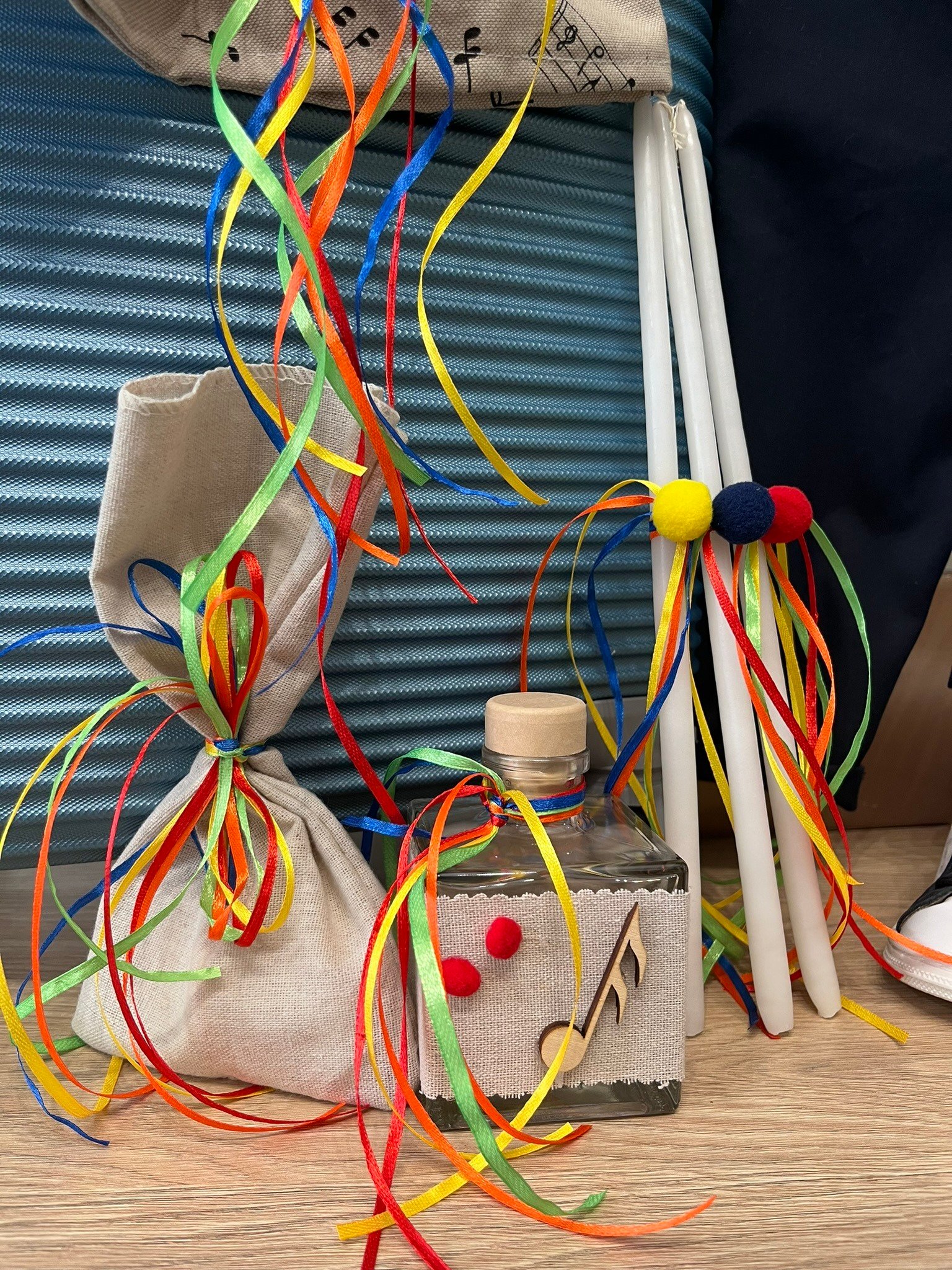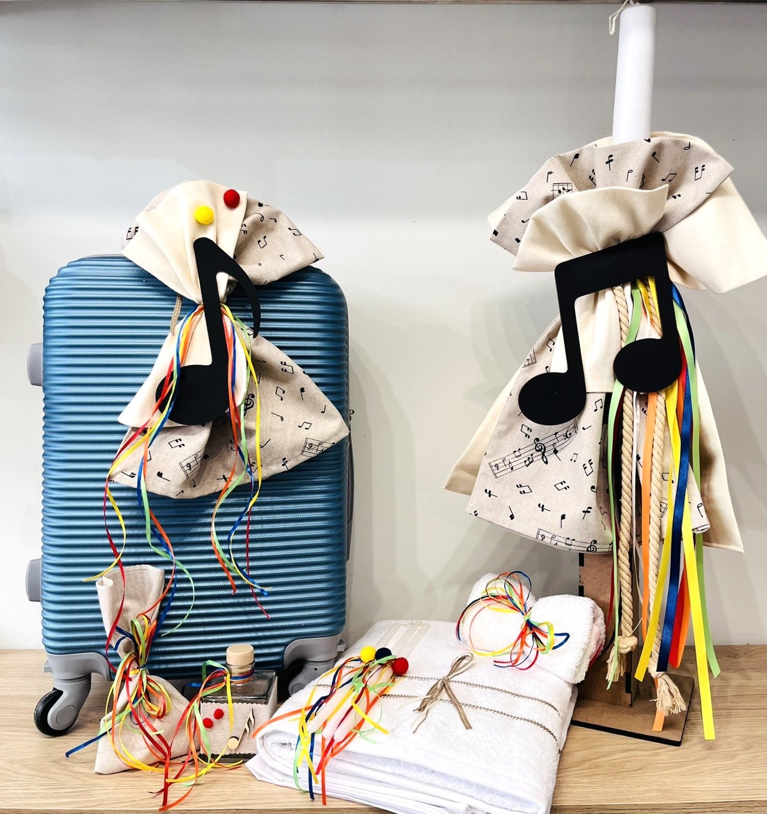 Λαμπάδα διακοσμημένη με υφασμάτινο φιόγκο, ξύλινη νότα και πολύχρωμες κορδέλες.