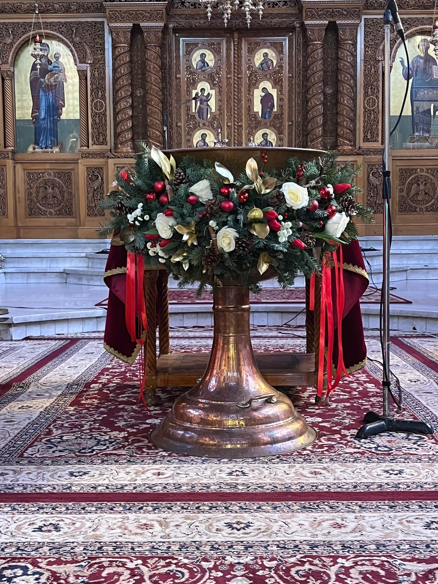 Η κολυμπήθρα, διακοσμημένη με χριστουγεννιάτικες λεπτομέρειες, αποπνέει ζεστασιά και λάμψη, δημιουργώντας το τέλειο σκηνικό για μια βάπτιση γεμάτη με γιορτινή ατμόσφαιρα.